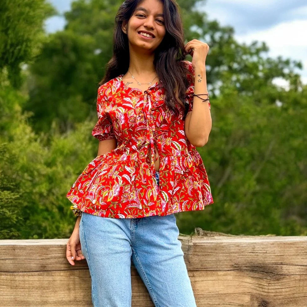 Elevate your casual wardrobe with this Red‑Green Cotton Peplum Bow Top. Made from soft, breathable cotton, the top features a flattering peplum silhouette with a bow‑tie detail at the waist and puff sleeves, offering a perfect blend of style and comfort.
