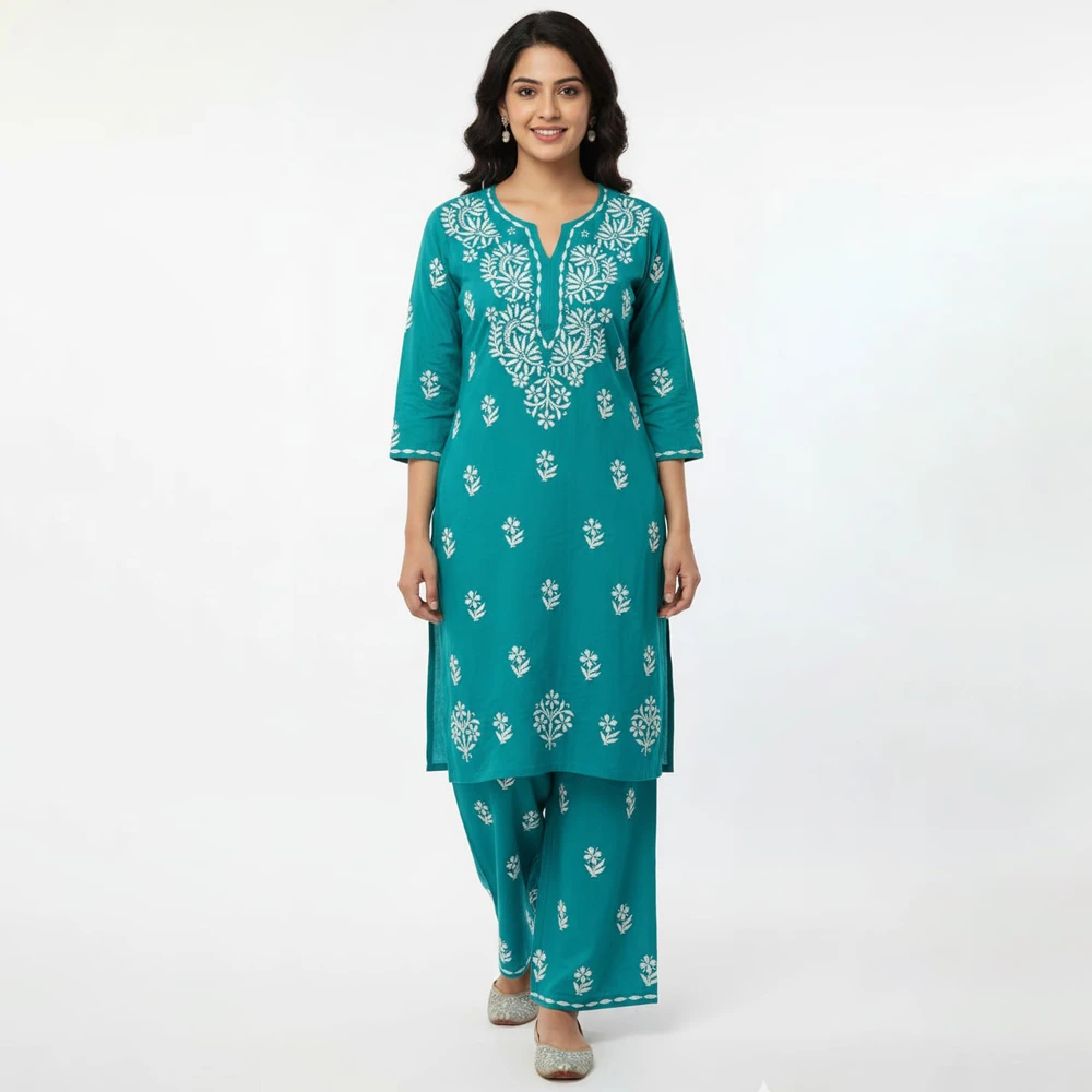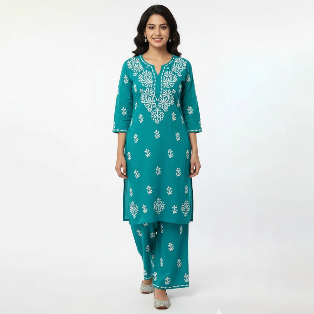 The soft turquoise cotton fabric ensures superior comfort, breathability, and ease of movement. Paired with a matching embroidered palazzo, this ensemble offers a perfect balance of style and comfort. Elegant, lightweight, and versatile, this kurta set is ideal for festive gatherings, office wear, family outings, and casual day events
