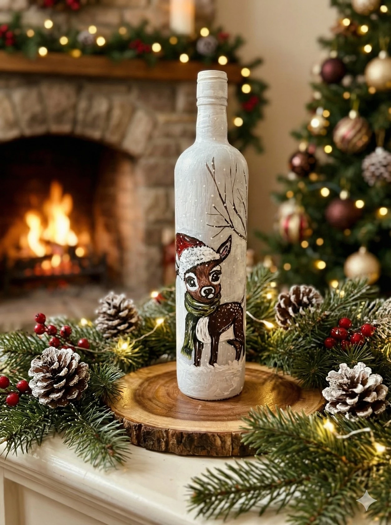 Brighten up your Christmas celebrations with this adorable hand-painted bottle lamp from Svamart. Featuring a heartwarming illustration of a wide-eyed baby fawn (reindeer) bundled up for winter, this piece captures the innocent joy of the holiday season.