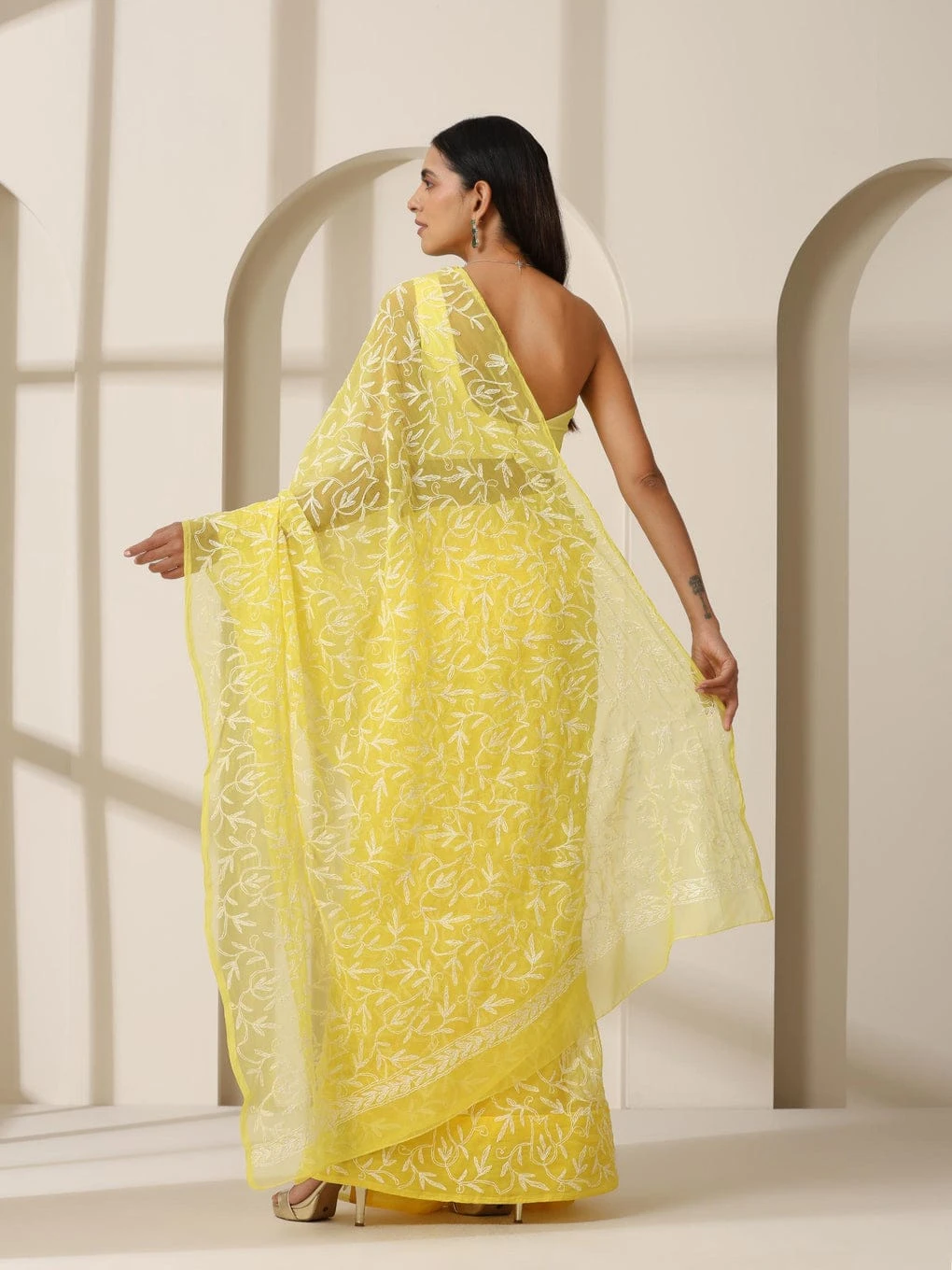 The refreshing yellow hue symbolizes freshness and joy, making this saree a perfect choice for daytime festivities, summer celebrations, weddings, and elegant social gatherings. Its fluid drape and airy texture ensure effortless comfort while maintaining a sophisticated look