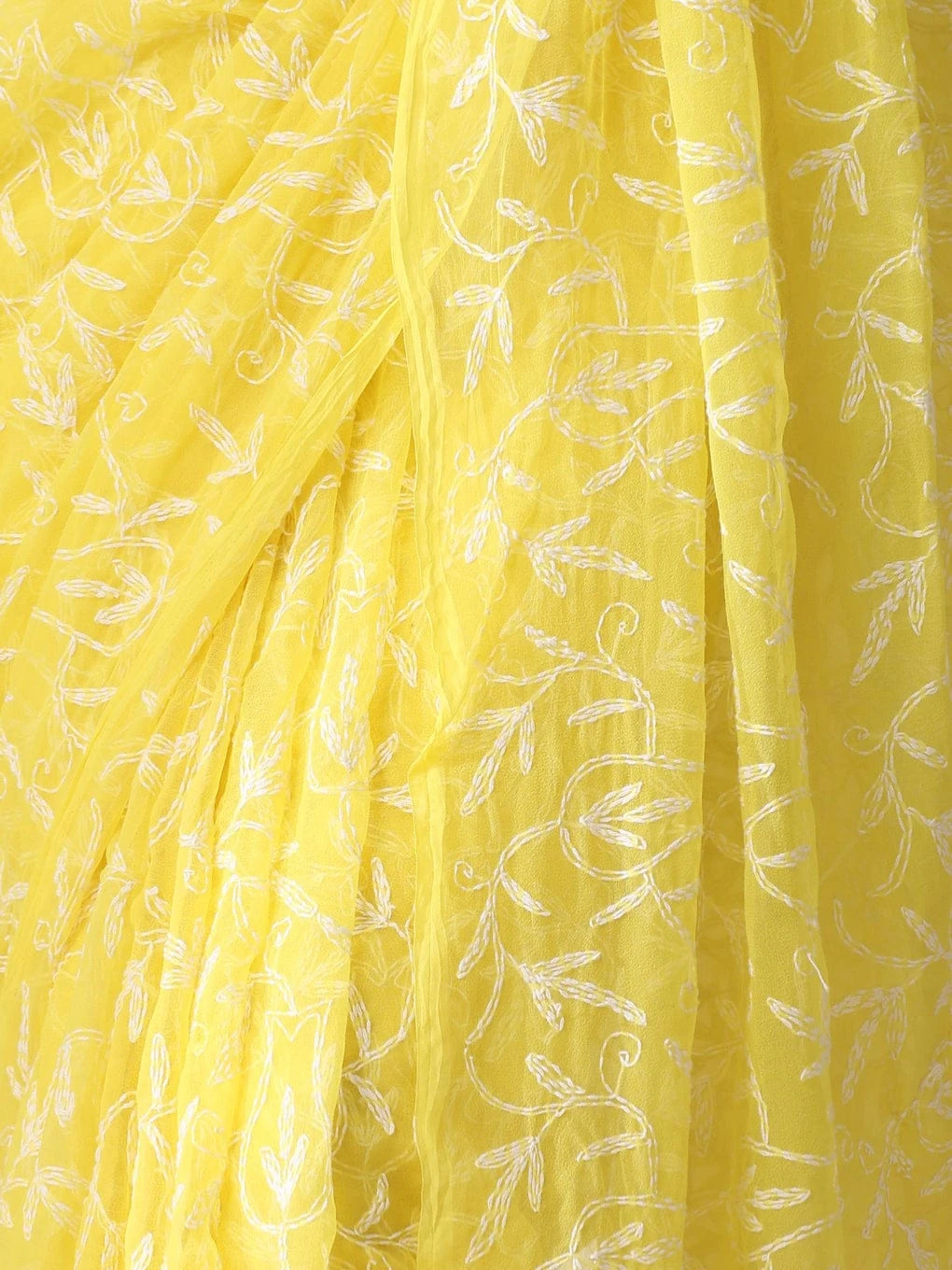 Radiate elegance and grace with this Yellow Lucknow Chikankari Tepchi Georgette Saree, beautifully handcrafted by master artisans of Lucknow. Made from soft, lightweight georgette, the saree features delicate Tepchi Chikankari hand embroidery arranged in refined floral and vine motifs across the body and pallu.